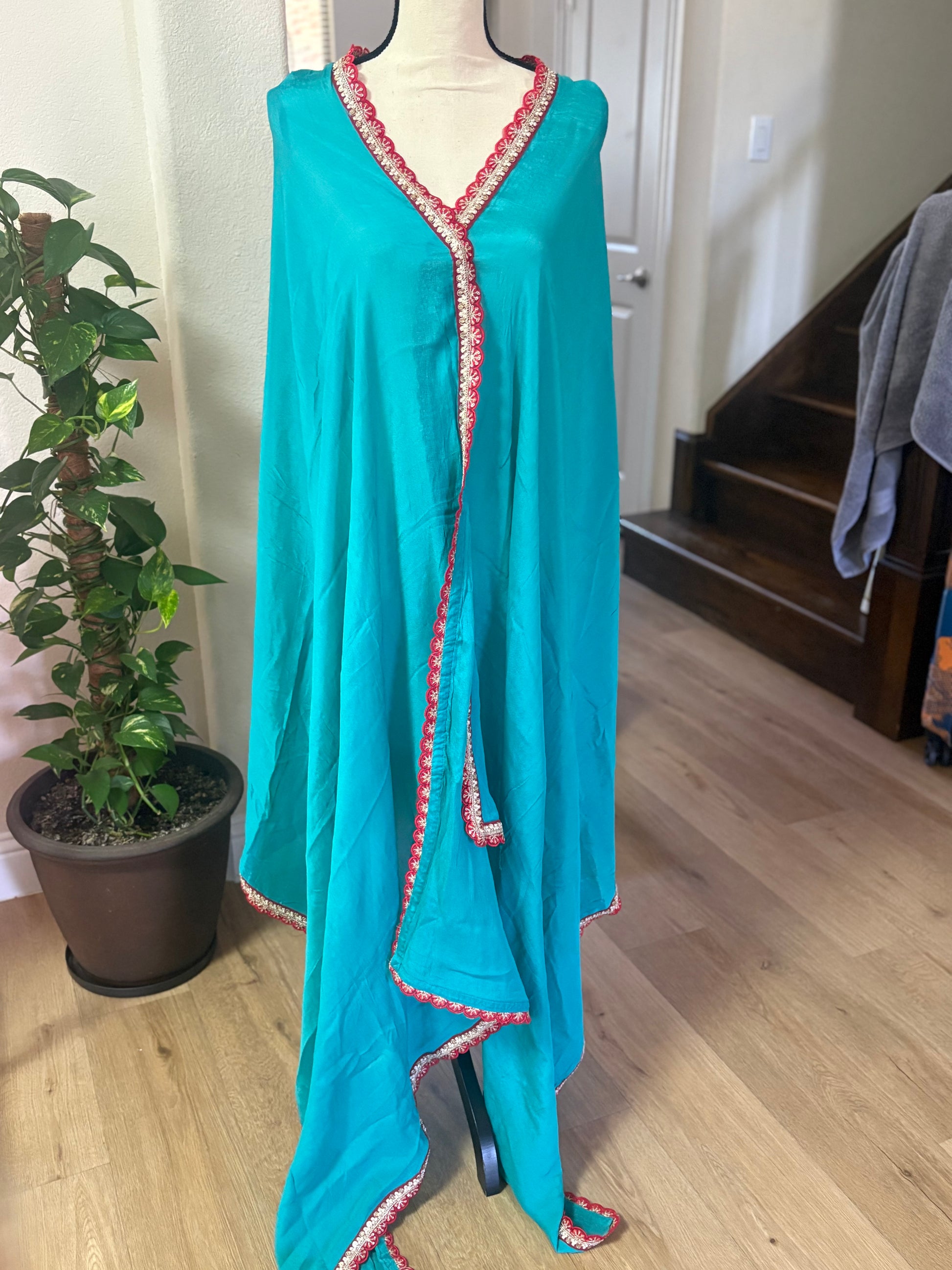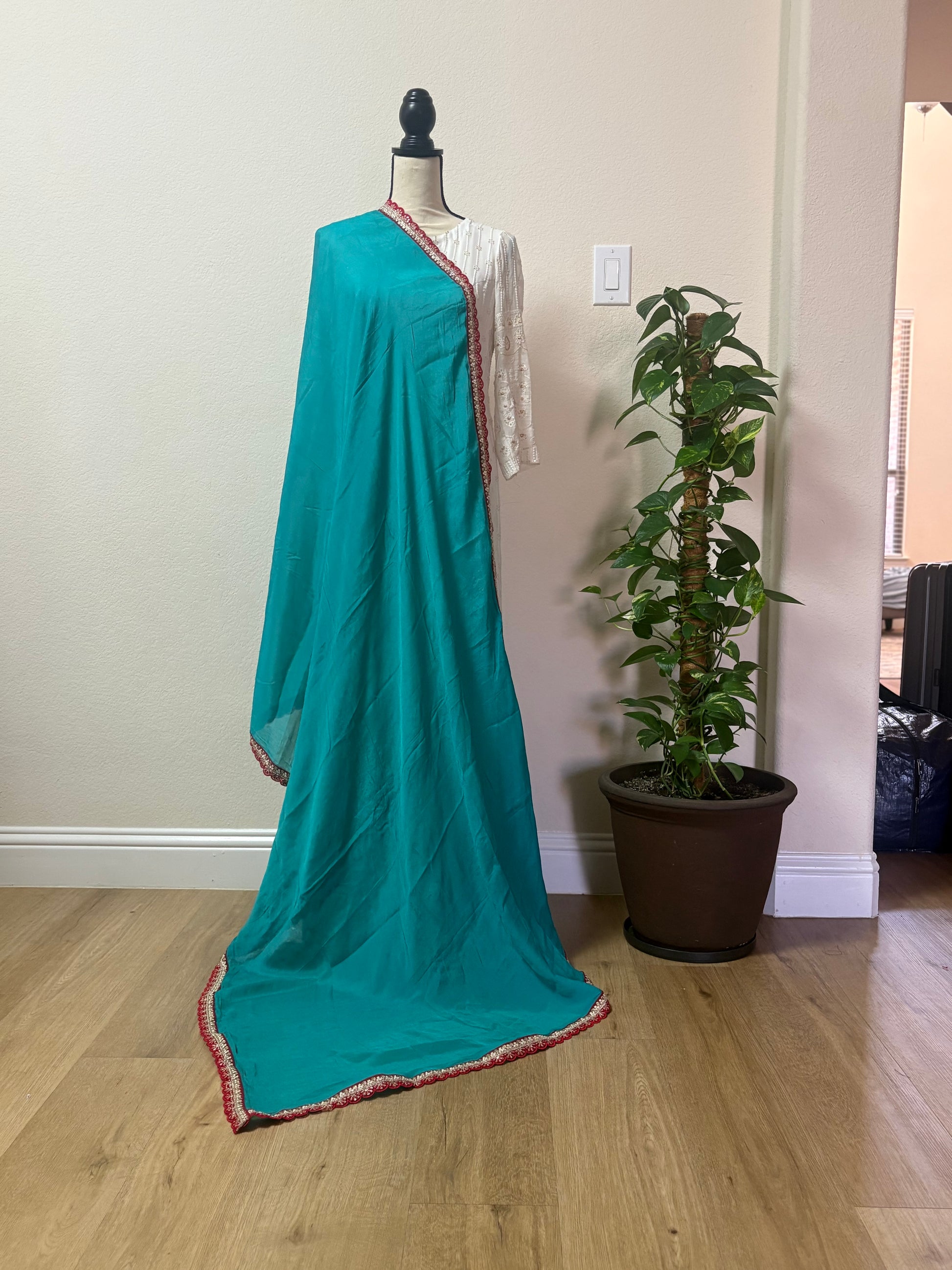 This vibrant turquoise dupatta is a graceful blend of tradition and elegance. Crafted from soft, flowing fabric, it is beautifully accented with a striking red and gold embroidered border that adds a touch of festive charm. The scalloped edge detailing enhances its overall appeal, making it a perfect accessory for festive occasions, weddings, or cultural celebrations. Pair it with a plain kurta or a heavily embroidered suit to elevate your ensemble with effortless style.