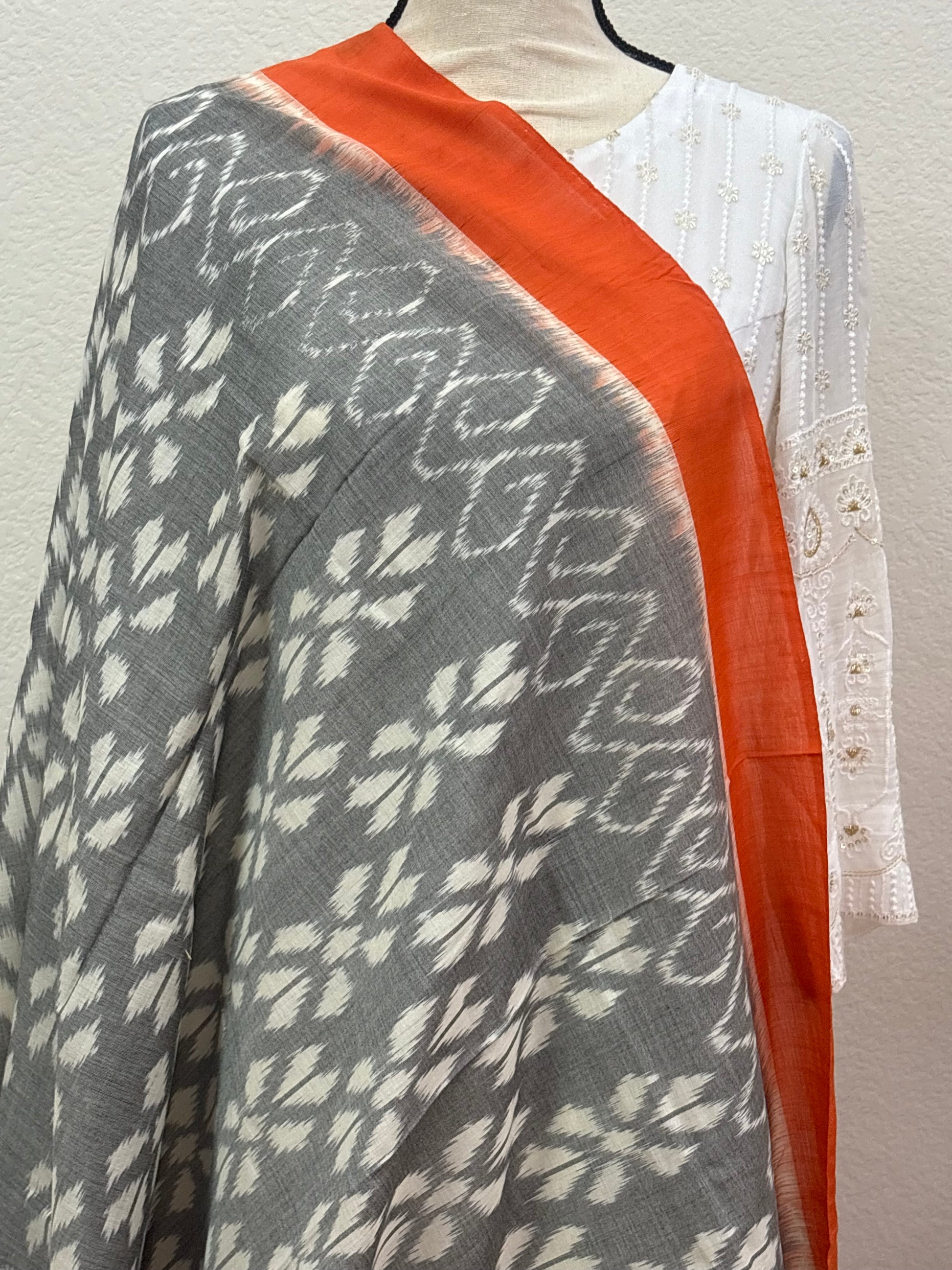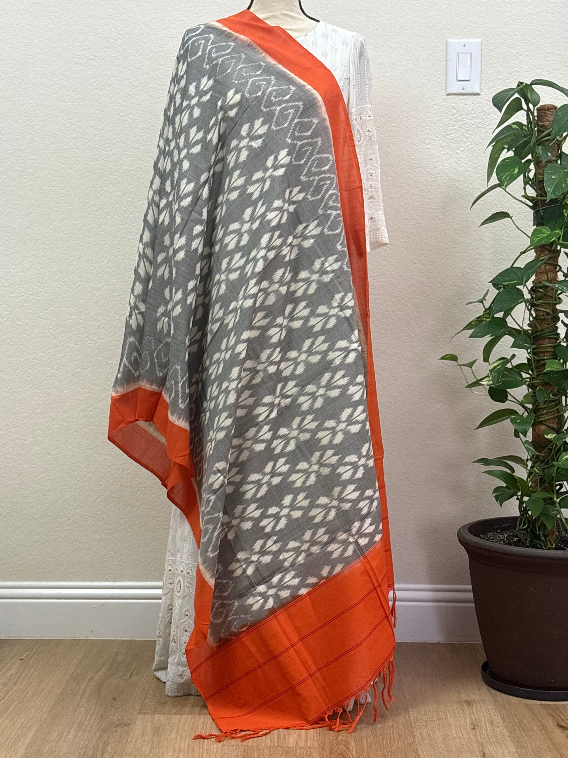 This grey cotton dupatta features classic Ikkat weaving patterns, showcasing traditional craftsmanship with vibrant, geometric designs. Lightweight and breathable, it drapes comfortably, making it perfect for everyday wear or festive occasions.