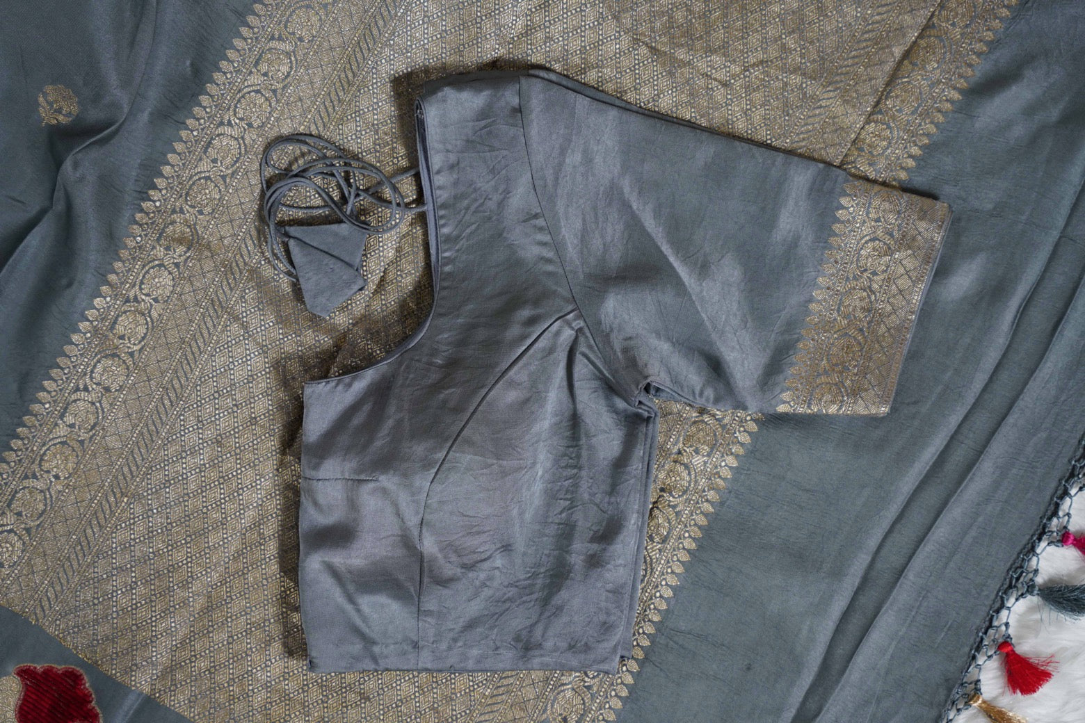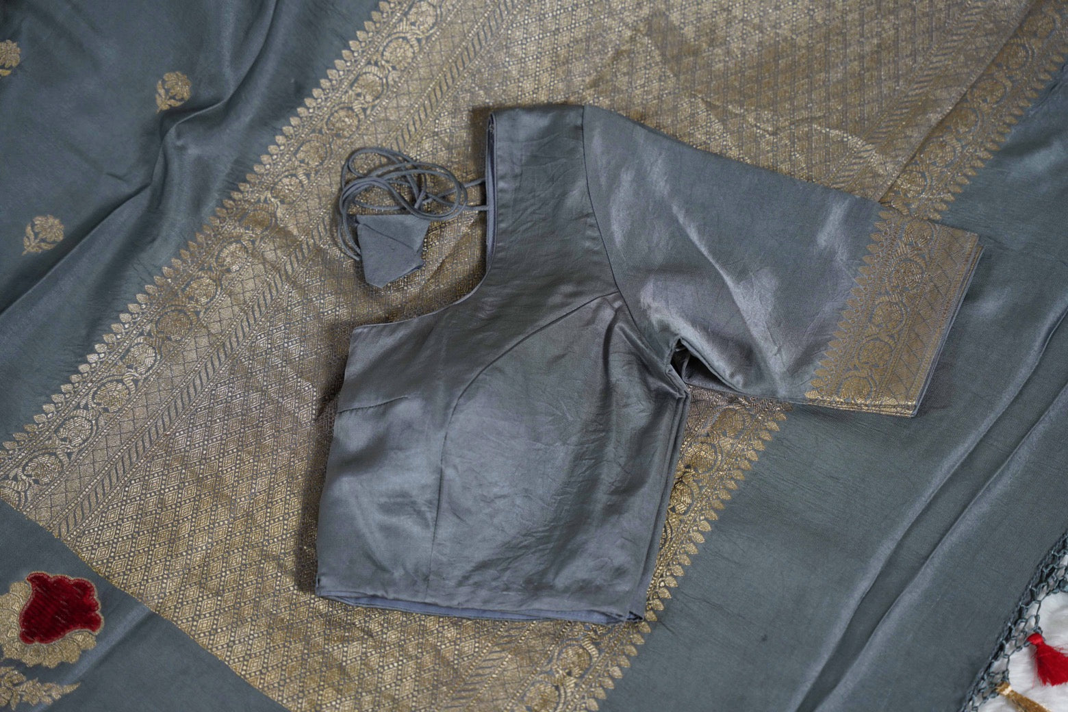 The Mashru Velvet Meenakari Banaras Saree in greyis a blend of traditional craftsmanship and luxurious fabric. Made from rich Mashru velvet, this saree features vibrant Meenakari work, a traditional Indian technique known for its intricate enamel-like designs, often in bright, contrasting colors. The saree’s pallu and border are beautifully adorned with velvet motifs, enhancing its overall elegance. The lilac color adds a soft yet sophisticated charm, making it ideal for festive occasions and weddings. The combination of velvet, Meenakari detailing, and fine embroidery offers a stunning, regal appearance.