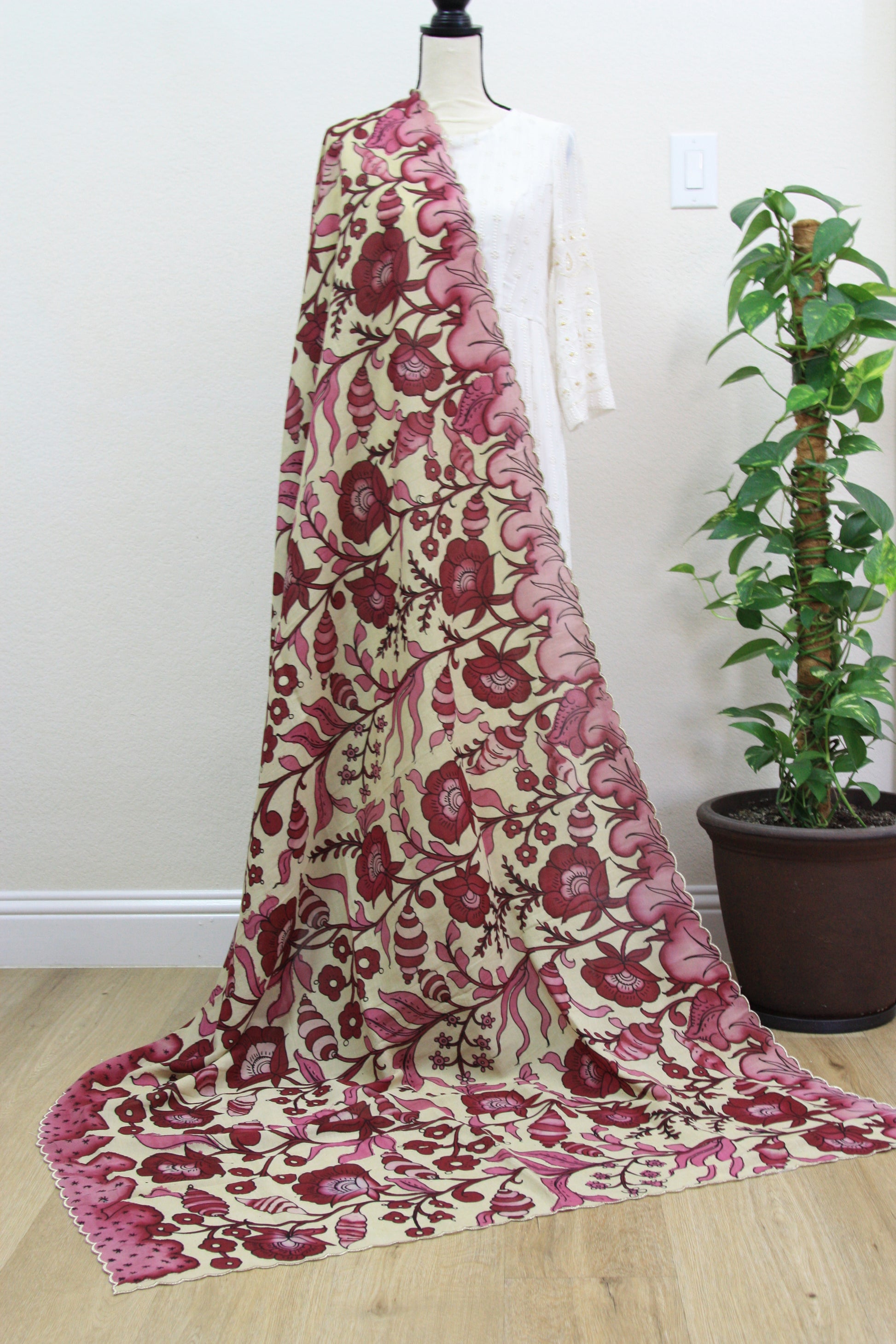 This beautiful cotton dupatta features intricate Kalamkari floral designs, showcasing the artistry of hand-painted and block-printed tradition. Lightweight and breathable, it drapes effortlessly, making it perfect for both casual wear and festive occasions.