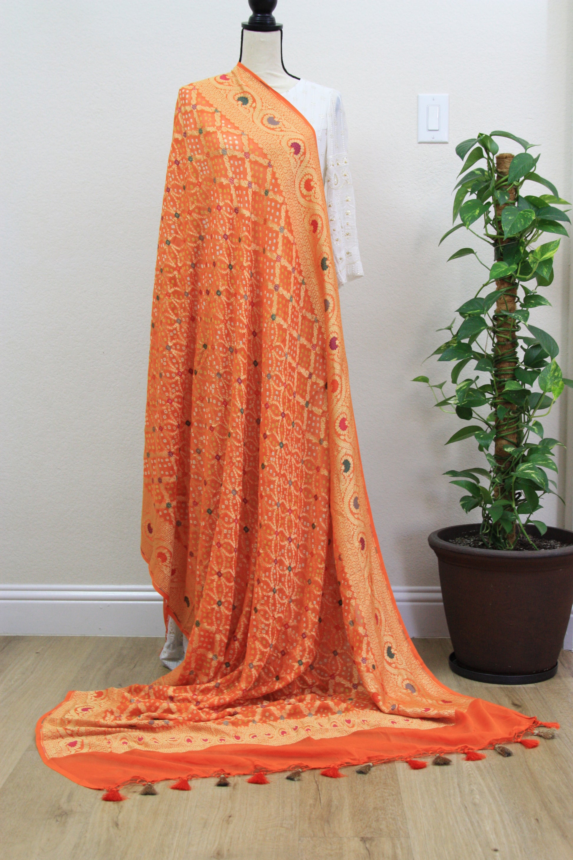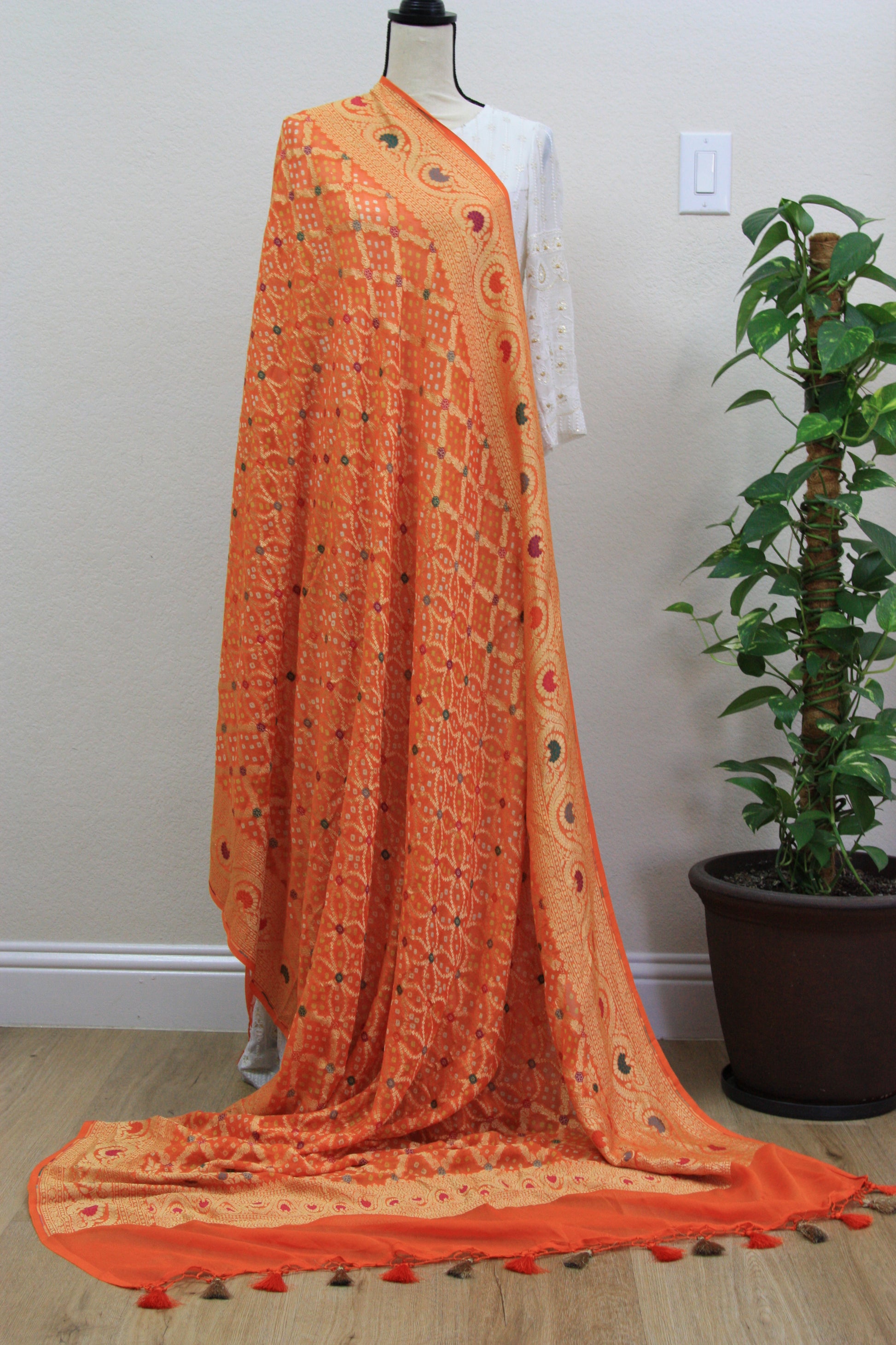 Orange Banarasi Georgette Bandhani Dupatta with Meenakari Work