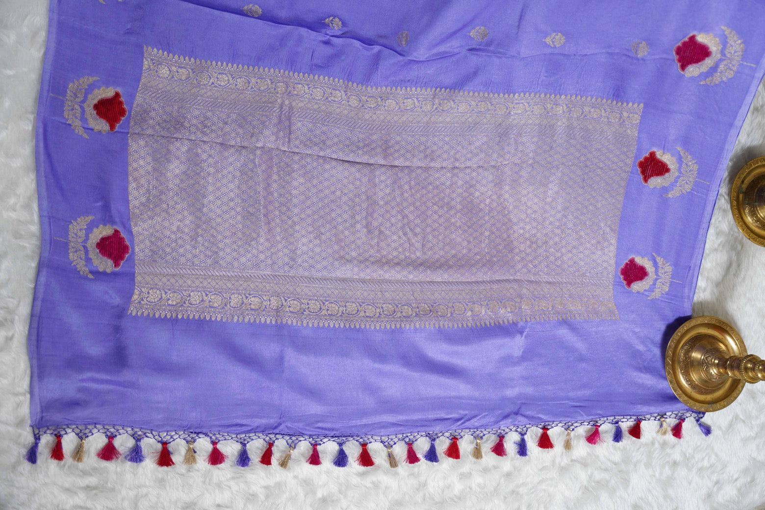 The Pastel Banaras Saree in lilac with velvet motifs is a blend of traditional craftsmanship and luxurious fabric. Made from rich banaras, this saree features vibrant Meenakari work, a traditional Indian technique known for its intricate enamel-like designs, often in bright, contrasting colors. The saree’s pallu and border are beautifully adorned with velvet motifs, enhancing its overall elegance. The lilac color adds a soft yet sophisticated charm, making it ideal for festive occasions and weddings. The combination of velvet, Meenakari detailing, and fine embroidery offers a stunning, regal appearance.