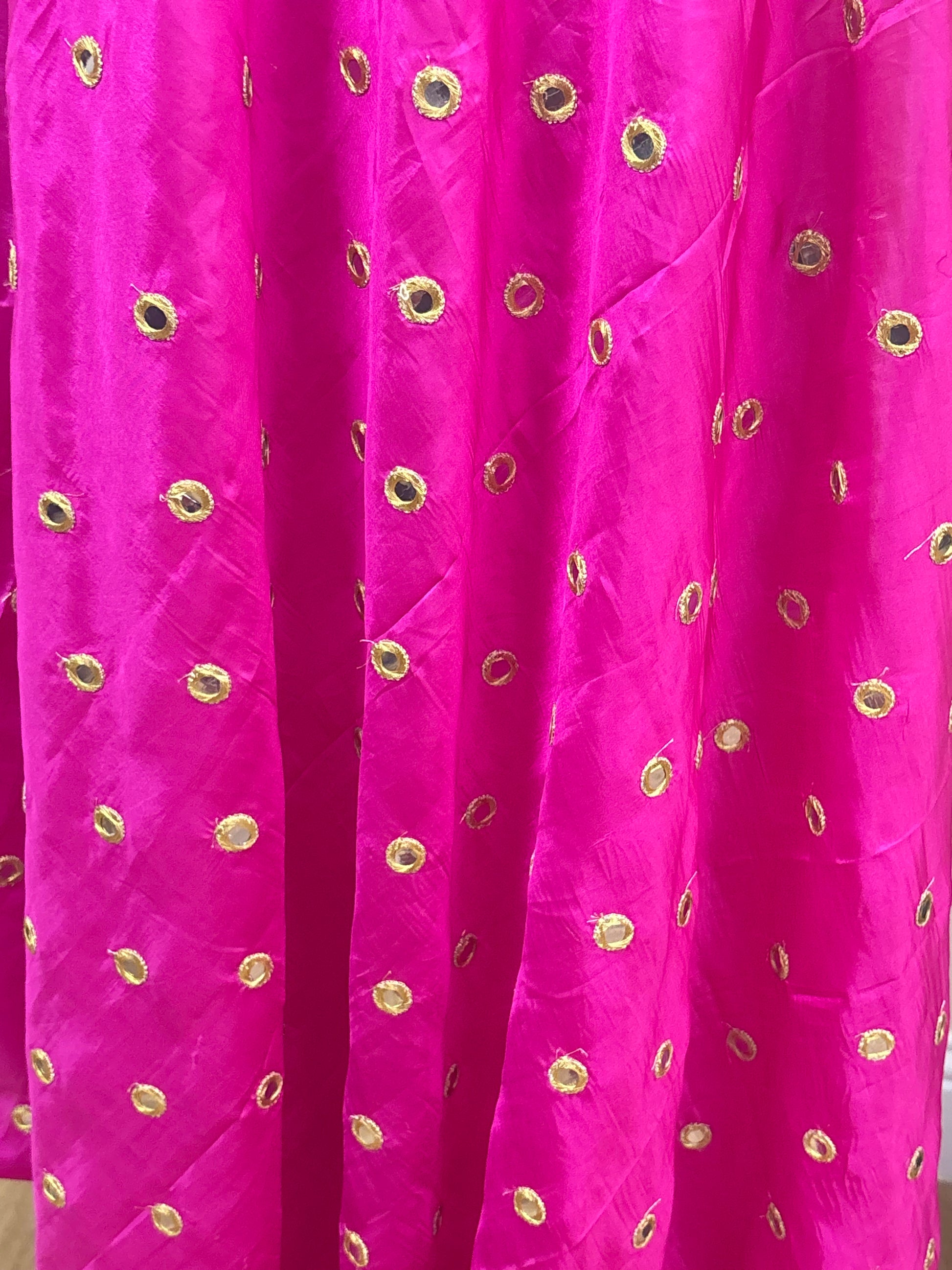 This elegant Pink dupatta is crafted from soft silk and adorned with delicate mirror work, adding a subtle shimmer and festive charm. The lightweight fabric drapes gracefully, enhancing the overall elegance of any lehenga, saree, or salwar suit.